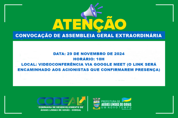 Nos termos do Estatuto Social da Companhia de Desenvolvimento de Águas Lindas de Goiás – CODEAL, da Lei n. 6.404/1976 (Lei das Sociedades por Ações) e da Lei n. 13.303/2016 (Lei das Estatais), ficam convocados os acionistas da CODEAL para a Assembleia Geral Extraordinária, a ser realizada conforme segue: