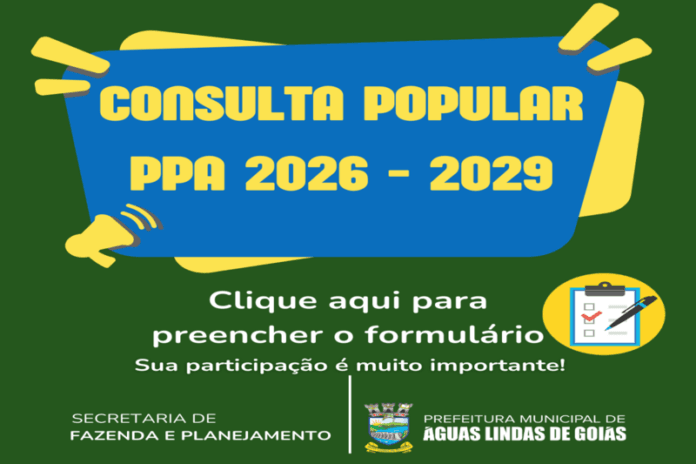 A Prefeitura Municipal de Águas Lindas de Goiás convida todos os cidadãos a participarem ativamente da construção do Plano Plurianual (PPA) 2026-2029 e da Lei de Diretrizes Orçamentárias (LDO) 2026. Este é um momento importante para a democracia e para a melhoria de nossa cidade, pois o PPA e a LDO definem as prioridades e os investimentos para os próximos anos.