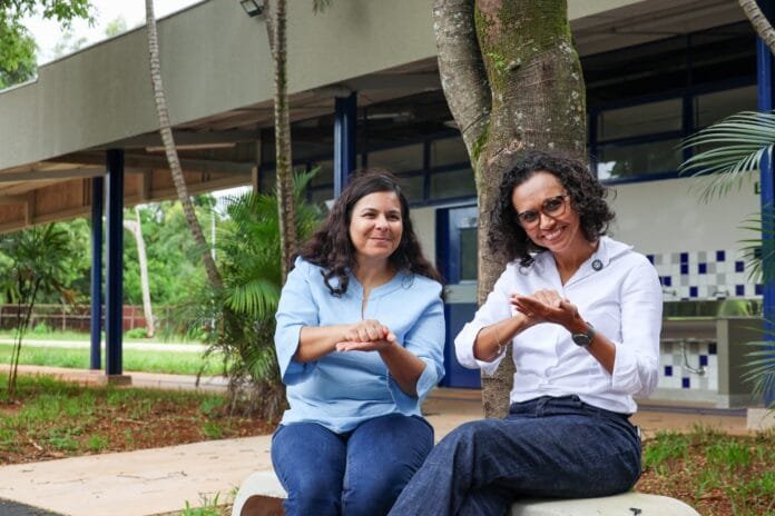 A equipe gestora da Escola Pública Integral Bilíngue Libras e Português Escrito do Plano Piloto, formada pela vice-diretora Thatiane Prado (de azul) e pela diretora Alliny Andrade, está ansiosa para receber os alunos | Fotos: Felipe de Noronha/SEEDF