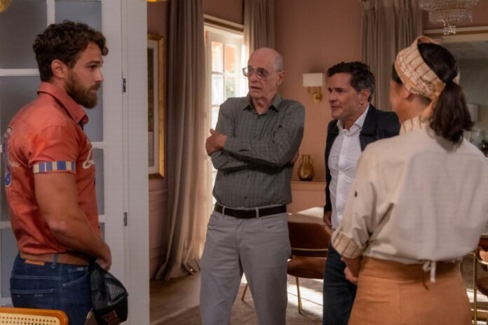 Mais tarde, como mostra a foto publicada pela coluna com exclusividade, Gael é recebido por Alaor (Marcos Caruso) e Alaorzinho (Daniel de Oliveira). Na infância, ele conheceu Naiane (Isabelle Drummond), e o reencontro vai mexer com os dois.