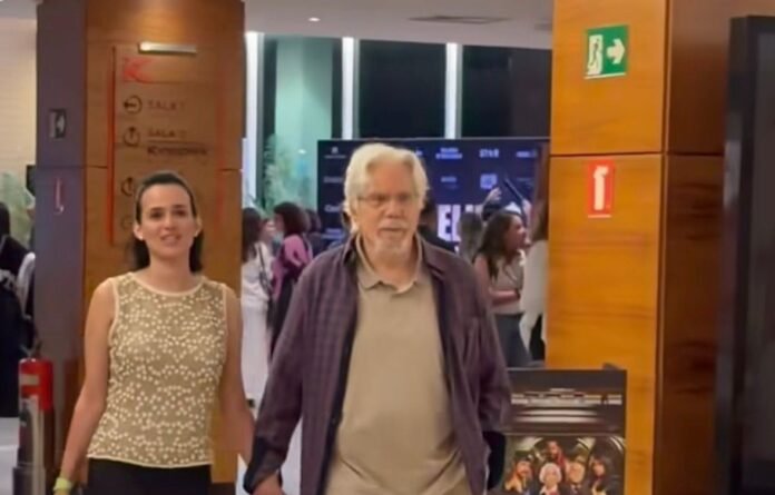 Reginaldo Faria, de 88 anos, fez um raro registro ao lado da namorada, a corretora de imóveis Joana Werneck, de 39. O casal marcou presença na pré-estreia “Velhos Bandidos”, no Rio, filme do qual o ator faz parte do elenco, e chegou ao cinema de mãos dadas, como mostra o registro acima, feito pelo perfil Radar Famosos.