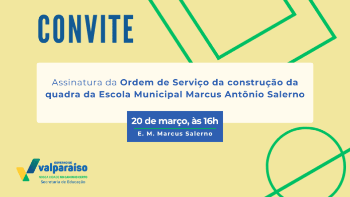 A Secretaria de Educação e a Prefeitura de Valparaíso de Goiás convidam a imprensa para a solenidade de assinatura da Ordem de Serviço para a construção da quadra da Escola Municipal Marcus Antônio Salerno.