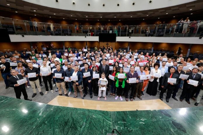 A Assembleia Legislativa de Goiás (Alego) realizou, nessa quinta-feira, 10, solenidade em homenagem a atletas das artes marciais. O evento foi iniciativa do deputado Ricardo Quirino (Republicanos). Além da entrega do Certificado do Mérito Legislativa aos atletas, o presidente da Federação Goiana de Futsal e presidente da Associação dos Delegados de Polícia Federal, Murilo Batalha Macedo, recebeu o Título de Cidadão Goiano.