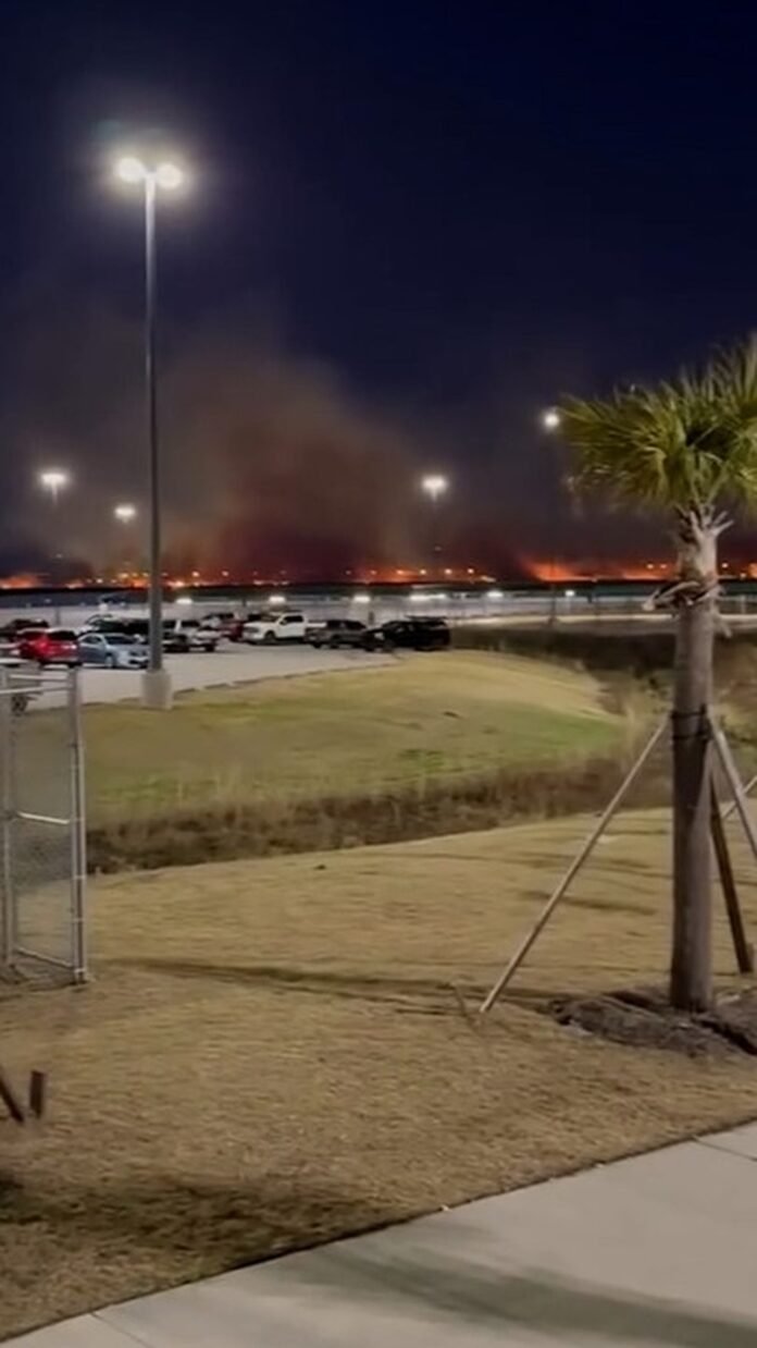 Um vídeo capturou longas chamas alaranjadas se espalhando por um campo de grama próximo à pista do aeroporto logo após o incidente.