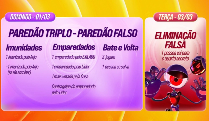 O calendário da semana no “BBB 26” foi divulgado mais cedo. Durante a tarde desta quinta-feira (26), Tadeu Schmidt entrou entre os comerciais da TV Globo para contar que essa semana a eliminação é falsa. A paredão de mentira voltará e uma nova dinâmica acontecerá na sexta-feira (27), quando conheceremos “o exilado”.