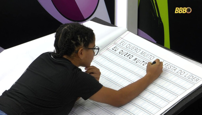 Hoje o “BBB 26” vai virar o boteco de Jonas Sulzbach para os participantes, mas Milena deve cumprir um desafio de caligrafia para ganhar um convite. A recreadora infantil foi escolhida por Jonas Sulzbach para o quarto do barrado no baile e precisa preencher as linhas das 50 páginas de um caderno pautado enorme, caso queira aproveitar. A missão é seguir o modelo e copiar a frase: “eu quero muito ir à festa do líder”.
