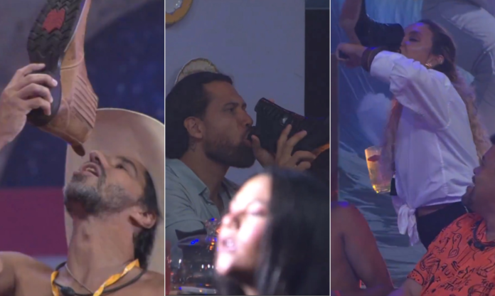 Em vários vídeos, a veterana Sarah Andrade aparece derramando bebida alcoólica em sua própria bota e na de Cowboy, distribuindo o conteúdo para outros participantes, como Jonas Sulzbach, Jordana, Brígido e o próprio líder da semana. Nas redes sociais, internautas que não acompanharam a festa se assustaram ao assistir às imagens.