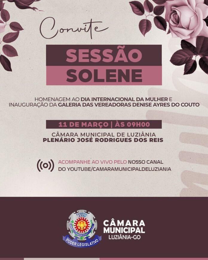 A Câmara Municipal de Luziânia (CML) vai celebrar o Dia Internacional das Mulheres, comemorado no último sábado (8), na sessão solene desta terça-feira (11), às 9h.