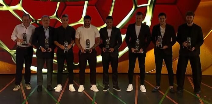 A Federação de Futebol do Estado do Rio de Janeiro (FERJ) premiou, nesta segunda-feira, os destaques do Campeonato Carioca de 2026, em um evento fechado no Teatro Roxy, em Copacabana, na Zona Sul do Rio de Janeiro. O Flamengo foi o grande campeão do torneio conquistando o 40º troféu (terceiro em sequência), mas foi o tricolor, com cinco nomes, que se destacou na seleção do torneio. Confira lista: