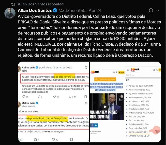 Na postagem, Allan dos Santos criticou a trajetória política da governadora, destacando suposta incoerência entre sua posição atual de aproximação com lideranças da direita e posturas adotadas no passado, especialmente durante os atos de 8 de janeiro de 2023. O jornalista relembrou o discurso de Celina Leão (PP) na época, quando ela defendia medidas repressivas contra os envolvidos.