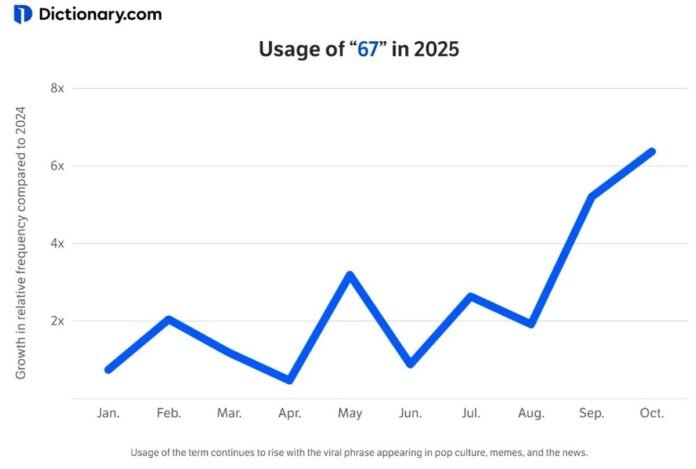 “Para selecionar a Palavra do Ano de 2025, nossos lexicógrafos analisaram uma grande quantidade de dados, incluindo manchetes de notícias, tendências nas redes sociais, resultados de mecanismos de busca e muito mais, para identificar palavras que impactaram nossas conversas, online e no mundo real. As buscas pelo número 67 tiveram um aumento drástico a partir do verão de 2025. Desde junho, essas buscas aumentaram mais de seis vezes e, até o momento, a tendência não mostra sinais de desaceleração. A maioria dos outros números de dois dígitos não apresentou nenhuma tendência significativa nesse período, o que sugere que o número 67 tem algo de especial”, explicou o site do dicionário.