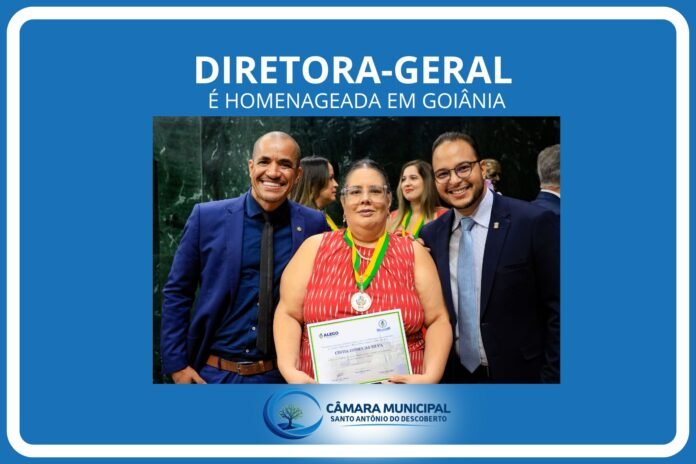 A Diretora-Geral da Câmara Municipal de Santo Antônio do Descoberto, Cíntia Gomes da Silva, foi homenageada na noite da última segunda-feira, 16 de março de 2026, em Goiânia, com a Medalha Pedro Ludovico Teixeira, a mais alta honraria concedida pela Assembleia Legislativa de Goiás.