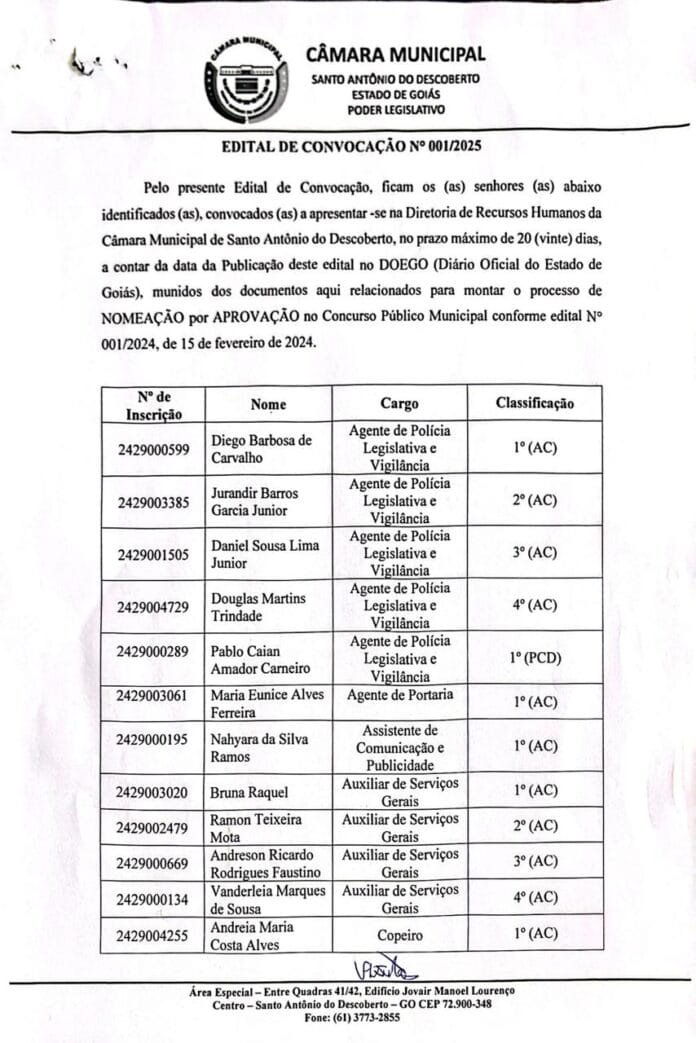 Fiquem atentos ao Diário Oficial do Estado de Goiás , onde será publicada a convocação oficial para o ingresso no cargo. É de extrema importância que os candidatos acompanharem o diário oficial regularmente para garantir o cumprimento de todos os prazos e procedimentos. A Câmara Municipal de Santo Antônio do Descoberto se orgulha de poder contar com a dedicação e o talento de novos servidores, que contribuirão para o fortalecimento da nossa cidade e o bom funcionamento da administração pública.