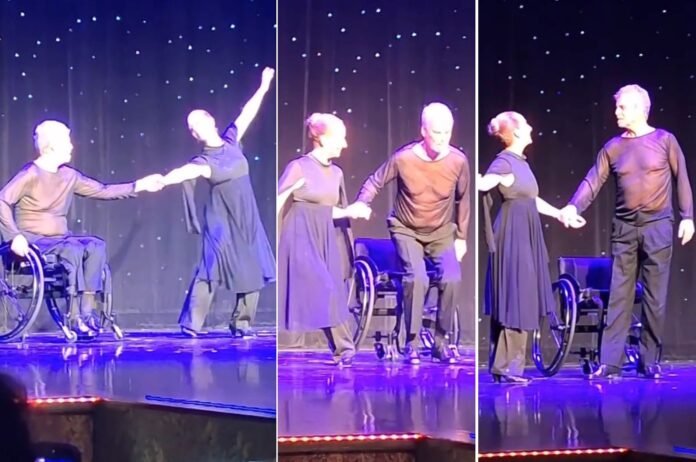Ao fim da apresentação, ele emocionou a plateia ao se levantar da cadeira e ficar de pé.