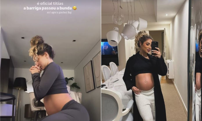 “É oficial, titias: a barriga passou a bunda (risos). Até agora ganhei 1 kg. Praticamente entrando no sétimo mês e esse neném já tá todo amostradinho”, escreveu ela, que logo depois também publicou uma foto exibindo a barriga em frente ao espelho.