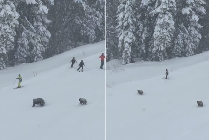 Enquanto desciam pela pista nevada, eles se depararam com três ursos-negros atravessando o local. Tentando chegar ao outro lado da montanha lotada, os ursos correm diretamente em direção aos esquiadores e snowboarders, bloqueando a passagem dos atletas que tentavam descer.