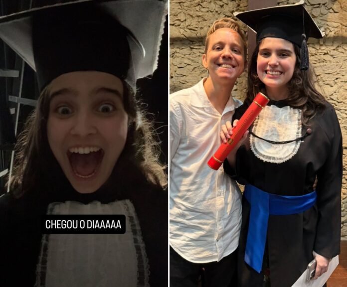 Filha mais velha do apresentador do Big Brother Brasil, Tadeu Schmidt, Valentina Schmidt se formou na última quinta-feira, 9, em Artes Cênica. A jovem, de 24 anos, compartilhou nas redes sociais fotos usando a tradicional beca, com a mãe, Ana Cristina, e o namorado, o psicólogo Cristiano Donnelly.