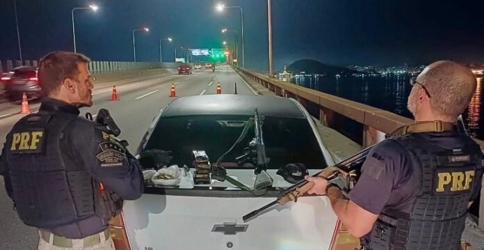 Equipes da Polícia Rodoviária Federal (PRF) apreenderam, na noite desta terça-feira, um fuzil calibre 7.62, uma granada, 150 peças de munição, sete carregadores e um colete à prova de balas na Ponte Rio-Niterói. O material estava espalhado na pista num local de acidente envolvendo uma motocicleta e um caminhão-guincho. O piloto da moto morreu no local.