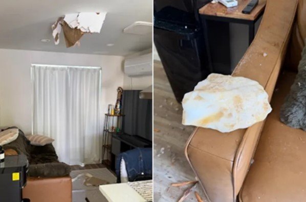 Ao se levantar, ele se espantou ao encontrar um pedaço do que parecia ser gelo sujo no chão da sala de estar da casa, em Whittier (Califórnia, EUA). O bloco havia atravessado o teto e caído sobre o sofá. Ninguém ficou ferido.