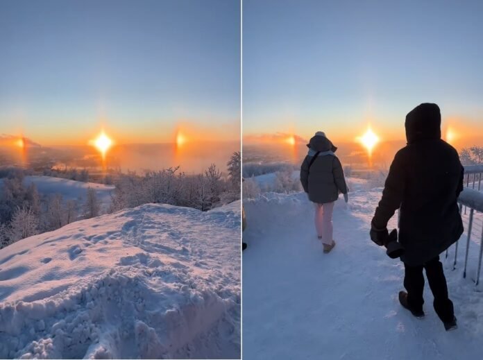 Um guia turístico compartilhou um vídeo fascinante mostrando “três sóis” brilhando no horizonte.