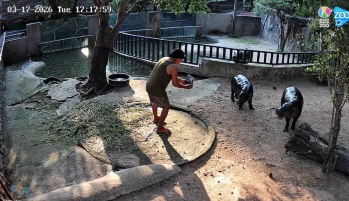 Imagens de segurança amplamente compartilhadas online mostram um homem usando gorro preto, óculos escuros, regata verde e bermuda marrom se aproximando de Moo Deng e da sua mãe, Jona, enquanto segurava um tablet, com o qual gravava vídeos.