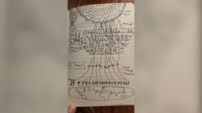 O “mapa” ou “diagrama” foi feito depois de dois anos que Yusuff foi declarado clinicamente morto. Ele mostra uma representação do universo, com pessoas conectadas por fios em diferentes camadas. No topo, há uma grande esfera que, segundo o autor, representa uma espécie de consciência coletiva.