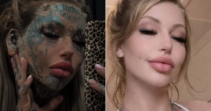 Apelidada de Dragão Branco de Olhos Azuis, australiana já gastou o equivalente a R$ 1,4 milhão para tatuar cerca de 95% da pele. Ela também é adepta de modificações corporais extremas, como tatuagem nos globos oculares, implante de chifres de silicone, alteração do formato das orelhas e língua bifurcada.