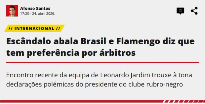 O veículo português também relembrou uma fala do presidente do Flamengo Luiz Eduardo Baptista, o BAP, sobre árbitros brasileiros.