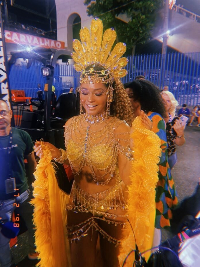 Juliana Alves, da Unidos da Tijuca, usa uma fantasia inspirada no bem-viver da mulher negra. A atriz desfilará na frente da Marcha das Carolinas, uma ala com personalidades diferentes que compartilham as mesmas experiências. Antes de posar para a foto, Anielle Franco, a ministra da Igualdade Racial, prestigiou a amiga. Ela decidiu não desfilar. Luyara Franco, filha da vereadora Marielle Franco, morta em 2018, representará a família.