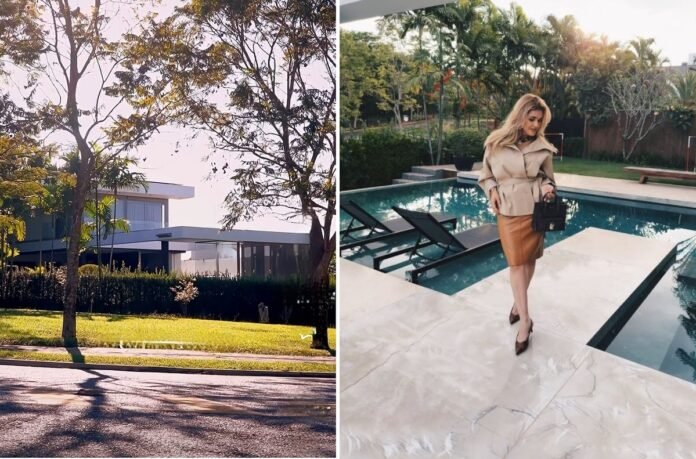 Com arquitetura moderna, a mansão ocupa um imenso terreno com muito verde no entorno. A área de lazer com piscina, campinho e área gourmet é o canto preferido da família de Andréa. O dela é seu elevador, circundado por mármore e lustres. |Amate de arte, ela adquiriu num leilão a obra Clara, das designers Sarah Castro e Juliana Bessa, um tamanduá-lustre de 1m80, que fica estrategicamente posicionado na sala principal.