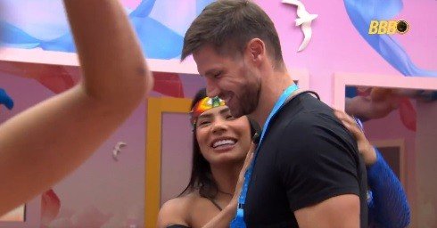 “Eu estava ansioso”, disse o veterano ao entrar no quarto em que eles dormem, ao lado das cozinhas. “Eita, meu Deus, que paixão”, disse Jordana ao ver Marciele abraçando o rapaz e dando um beijinho nele. Cunhã, então, respondeu: “Que delícia, achei até mais bonito o Jonas… Estou brincando”. Gabi reparou: “O sorrisão dele”.