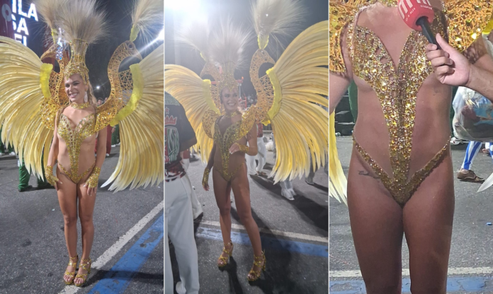 Em seu terceiro ano como musa da Grande Rio, Mariana Goldfarb virá mais uma vez no chão. Vestida de amarelo e dourado, a ex de Cauã Reymond desfilou com a tatuagem íntima à mostra.