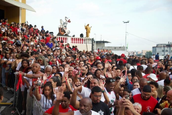 Desde os primeiros minutos do dia, a Rua Clarimundo de Melo, em Quintino, na Zona Norte, já era tomada por um mar vermelho de fé. Antes mesmo da meia-noite, devotos começaram a chegar à Igreja Matriz de São Jorge, muitos carregando folhas de espada de São Jorge, velas e terços — símbolos de proteção e resistência associados ao santo guerreiro. Outros caminhavam em silêncio ou entoavam orações. Alguns choravam.