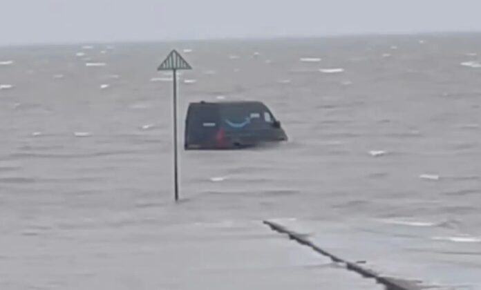 Um motorista de entregas da Amazon foi obrigado a abandonar sua van após seguir instruções de GPS e e acabar no meio de um rio durante a maré alta.