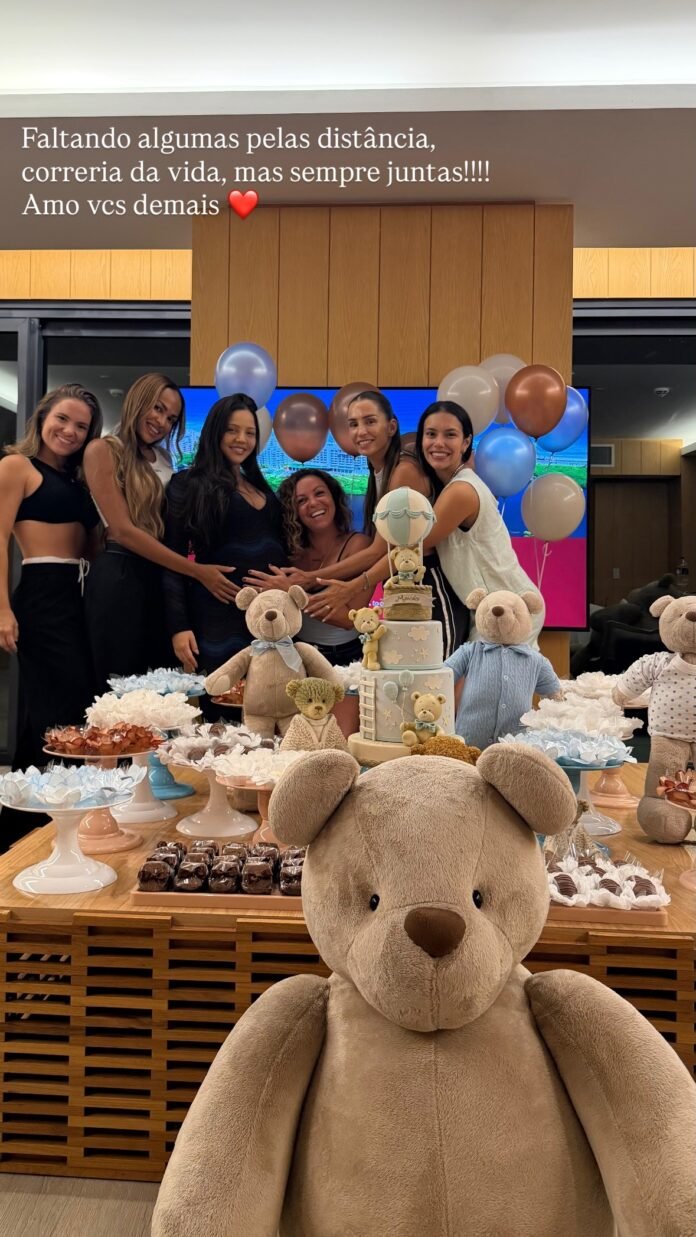 Foi ela quem mostrou a festa preparada pelas amigas, entre elas Gisellen Ramalho, mulher de Bruno Henrique, e Patricia Buno, casada com Filipe Luis, agora ex-técnico do Flamengo.