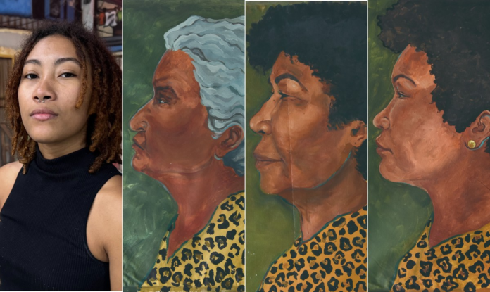 Aos 22 anos, a artista carioca Beatriz Botelho, do Estácio, que assina como Bibica, apresenta a obra “Dinastia das Mulheres Onças”, produzida em óleo e acrílico sobre tela. Ela conta que começou a desenhar ainda pequena, quando desenhava animais e pessoas nas paredes da casa de seus avós, sempre incentivada pela família. A obra que expõe agora retrata sua mãe, avó e bisavó, mulheres que considera o centro da sua formação afetiva e artística. “Eu devo tudo a elas. Sempre me deram tanto apoio que tive coragem para sonhar, para entrar na universidade e até para sair do Rio e tentar a vida em São Paulo”, afirma.
