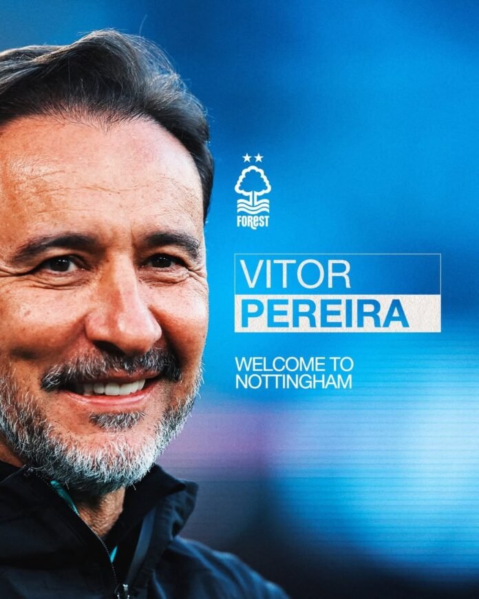“O Nottingham Forest tem o prazer de confirmar que Vítor Pereira foi nomeado Treinador Principal num acordo de 18 meses”, comunicou o clube, em nota, que também citou a equipe técnica que o acompanharia: “Juntar-se-á à equipa técnica Filipe Jorge Monteiro Almeida (Treinador Assistente), Luis Miguel Moreira Da Silva (Treinador Assistente), Bruno Filipe Araujo De Moura (Chefe de Performance Física e Análise de adversário), e Pedro Simao Capela Silva Lopes (Analista de adversário)”.
