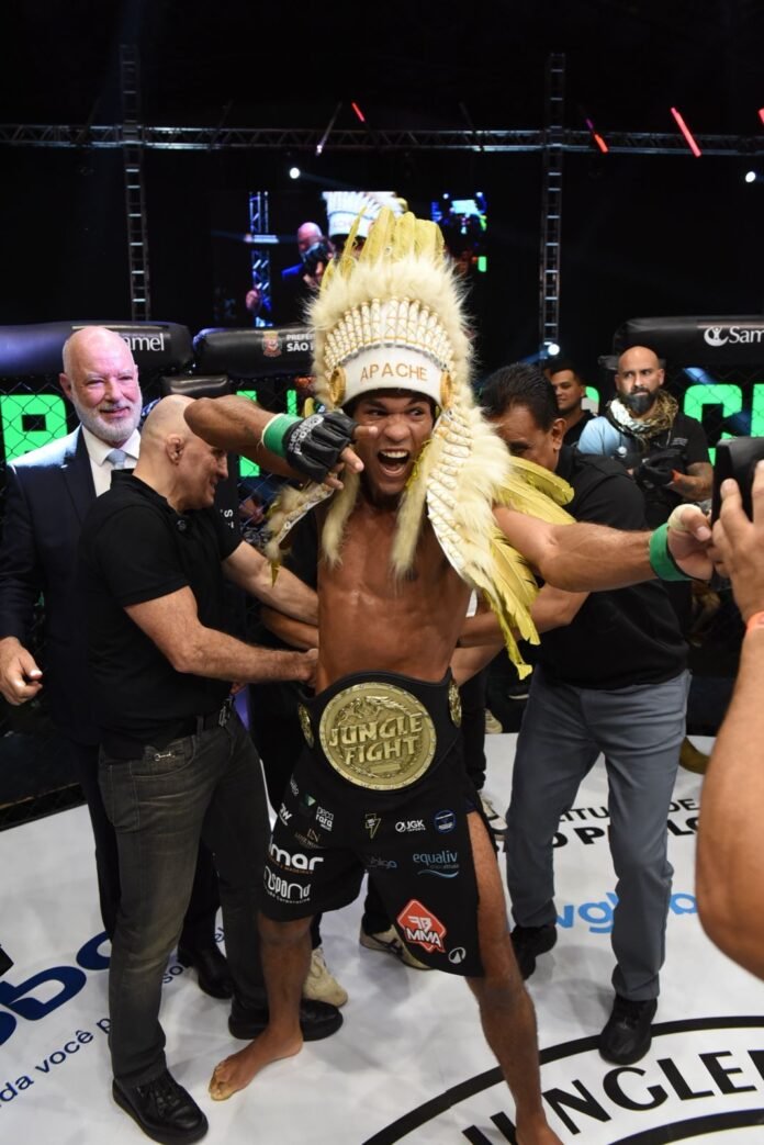 Emerson Apache conquistou o primeiro cinturão mundial dos penas do Jungle Fight ao vencer o equatoriano Alejandro Delgado com autoridade. Superior durante a maior parte da luta, o brasileiro impôs ritmo forte desde o primeiro round, conectando combinações de socos, cotoveladas e, principalmente, joelhadas no corpo e na cabeça. Delgado resistiu enquanto pôde, mas acabou sucumbindo no terceiro assalto, após uma sequência decisiva que incluiu uma joelhada no rosto e golpes finais que levaram à interrupção.