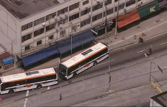 Ônibus são usados para bloquear via na Praça Seca, após confronto na Covanca