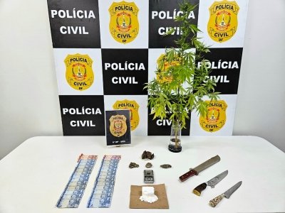 Durante a diligência, os policiais realizaram a abordagem no exato momento de uma transação, o que resultou na prisão em flagrante dos dois indivíduos. Com eles foram apreendidos mais de 100g de cocaína, porções de maconha, uma porção de haxixe, uma balança de precisão, dinheiro em espécie e um pé de maconha.