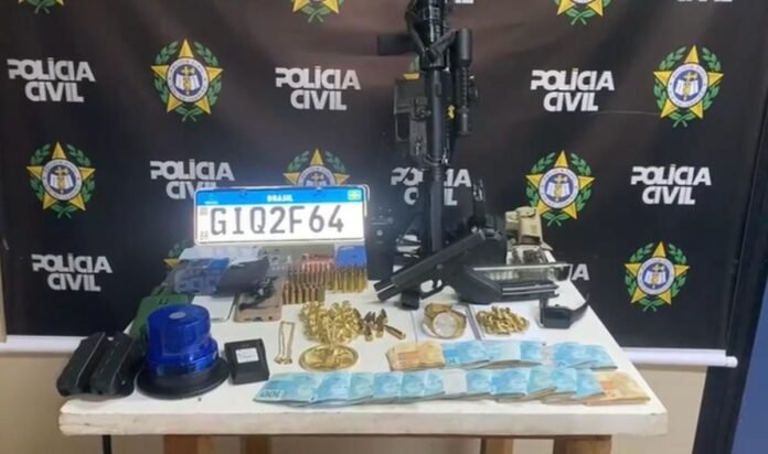 Num Toyota Corolla preto os policiais encontraram um fuzil calibre 5,56mm, uma pistola Glock calibre .40mm, dois carregadores de pistolas, dois carregadores de fuzil, munição, um rádio de comunicação, um giroscópio, um caderno com anotações de cobrança, placas de veículos e R$ 19.500 em dinheiro.
