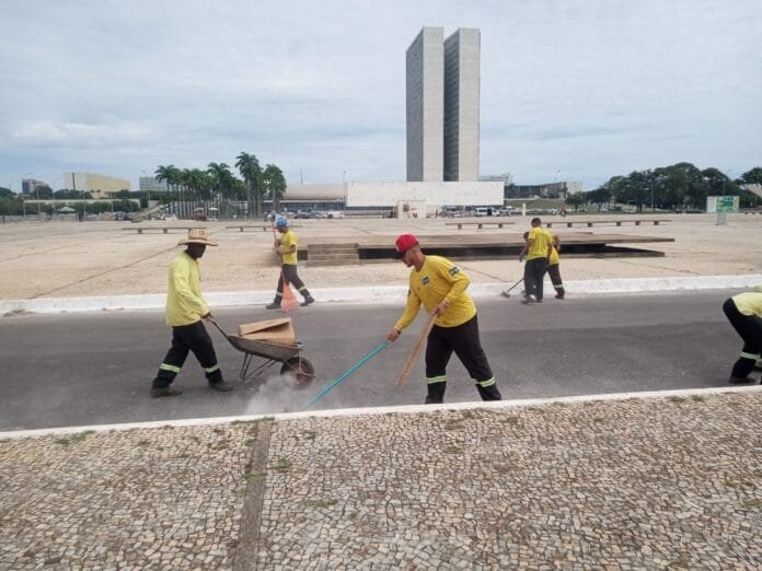 A Praça dos Três Poderes, marco da arquitetura modernista de Brasília, recebeu nesta sexta-feira (4), um mutirão de limpeza e zeladoria da qual participaram 20 reeducandos. Durante a ação, foram feitos serviços de varrição, lavagem, retirada de gramíneas e lixo, incluindo plásticos e embalagens.