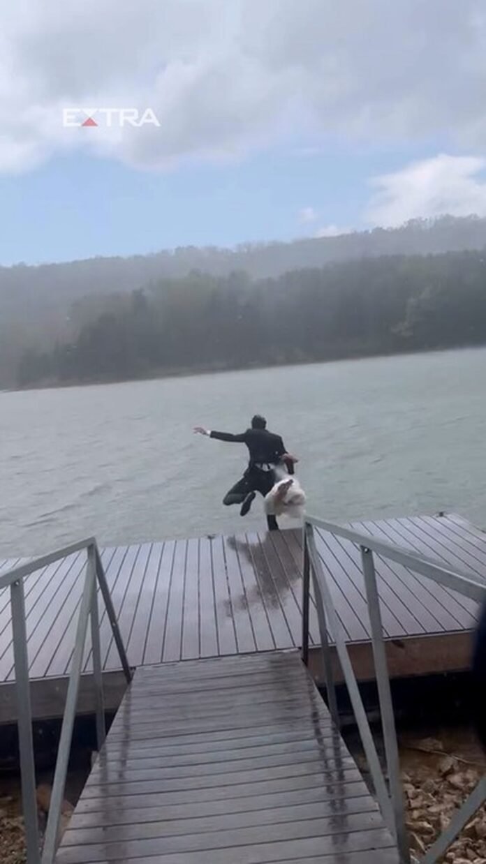 Previsão do tempo falha, noivos se casam debaixo de temporal nos EUA e acabam se jogando em lago