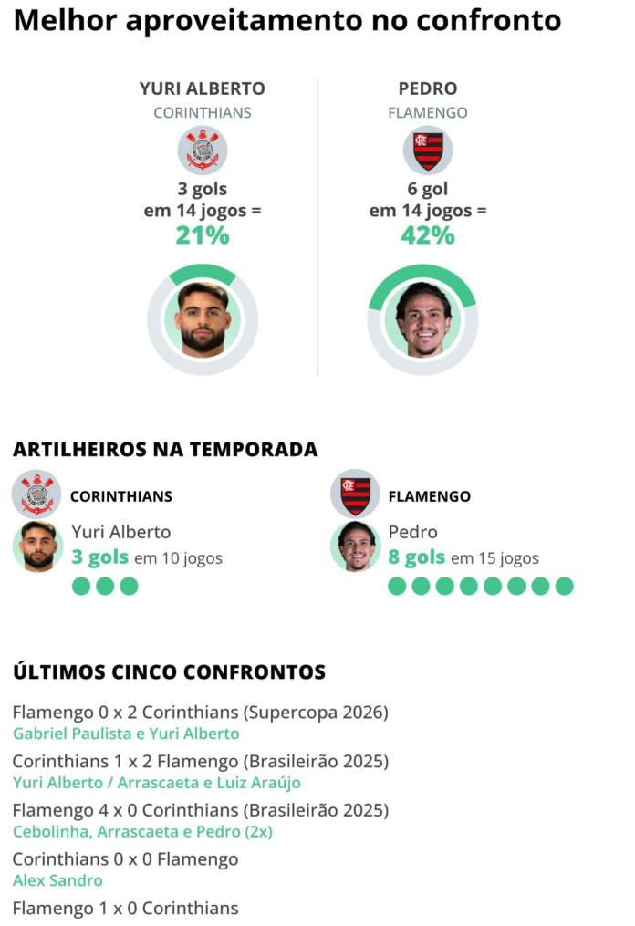 O retrospecto recente mostra equilíbrio, mas com leve vantagem alternada entre os lados. No encontro mais recente, o Corinthians venceu o Flamengo por 2 a 0 na Supercopa de 2026, com gols de Gabriel Paulista e Yuri Alberto. Antes disso, pelo Brasileirão de 2025, o Flamengo venceu por 2 a 1, com gols de Arrascaeta e Luiz Araújo, enquanto Yuri Alberto descontou. Ainda naquela edição, o rubro-negro aplicou uma goleada por 4 a 0, com gols de Cebolinha, Arrascaeta e Pedro (duas vezes). Pela Copa do Brasil de 2024, houve um empate sem gols e uma vitória do Flamengo por 1 a 0, com gol de Alex Sandro.