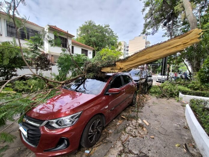 Uma árvore caiu em cima de dois carros e atingiu um ciclista no Grajaú, na Zona Norte do Rio, na manhã deste sábado. O professor de Educação Física Douglas Barboza, de 31 anos, sentiu uma pancada na cabeça e teve as costas arranhadas, mas foi parcialmente protegido pelos veículos estacionados no local. O tronco ficou apoiado em cima deles.