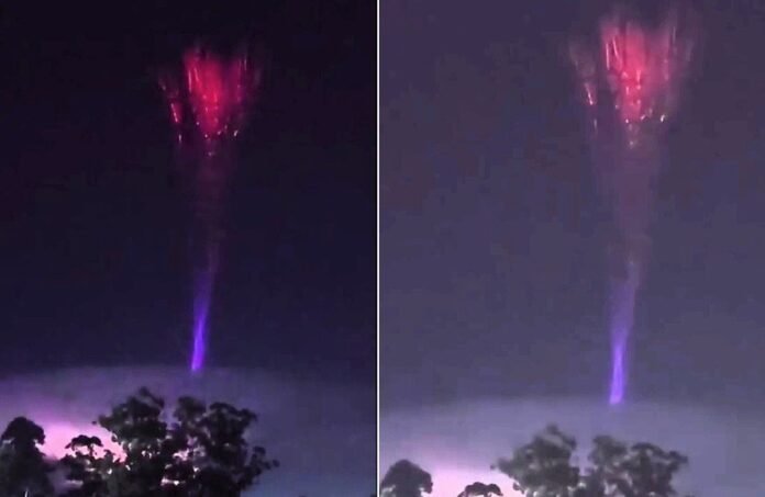O fenômeno impressionante, conhecido como Gigantic Jet ou Blue Jet, – que parece saído de um filme de ficção científica – foi filmado saindo de uma nuvem direto para a estratosfera.