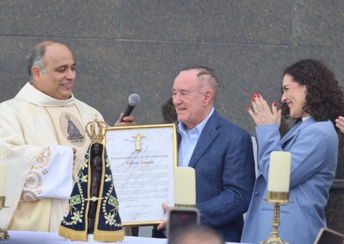 O humorista Renato Aragão recebeu o título de Embaixador do Cristo Redentor para a Cultura e o Turismo em cerimônia pelos 94 anos do monumento, celebrados neste domingo (12). Ao lado da filha, Livian Aragão, e da esposa, Lílian Taranto, o comediante se emocionou com a homenagem, concedida durante Missa de Ação de Graças, ministrada por Padre Omar no Santuário da Arquidiocese, no Cristo Redentor. Na celebração, o ator coroou a imagem de Nossa Senhora Aparecida, também homenageada hoje.