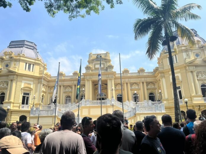 Professores, bombeiros militares, técnicos administrativos, enfermeiros. Servidores de diferentes categorias se reuniram nesta quarta-feira (dia 18), em frente ao Palácio Guanabara, sede do governo do estado, para pressionar pela recomposição salarial de 2024 e 2025, além do pagamento das duas parcelas restantes da Lei Estadual 9.436/2021 (acumulado no período de 2017 a 2021).