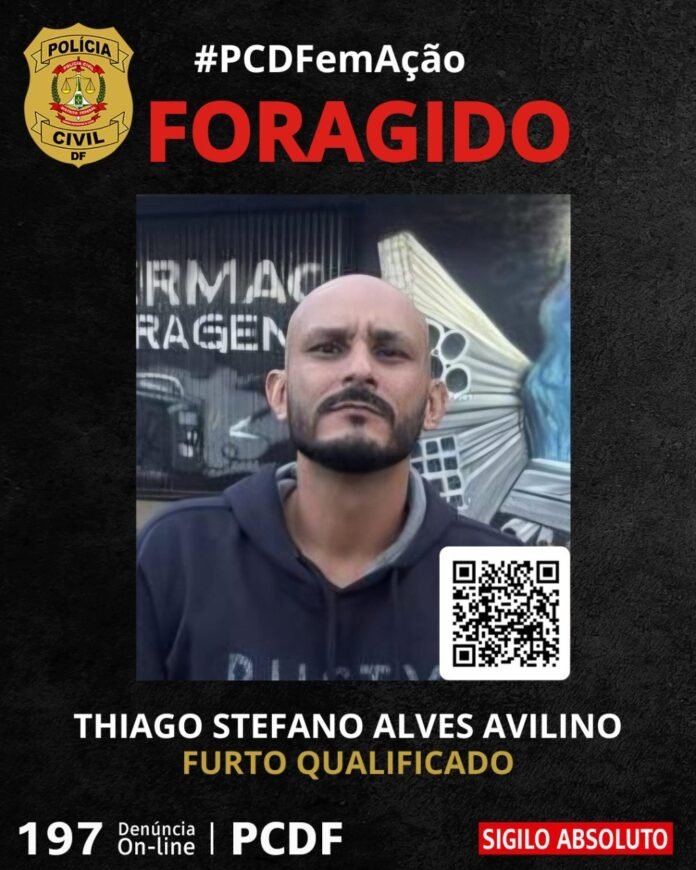 A Polícia Civil do Distrito Federal divulgou um cartaz para pedir informações sobre o paradeiro de um homem apontado como integrante de um grupo especializado em furtos a residências em áreas nobres do DF. O suspeito é como Thiago Stefano Alves Avilino. Segundo a corporação, ele atua junto a uma mulher, que foi presa, e a um outro homem, ainda sem ter sido identificado.