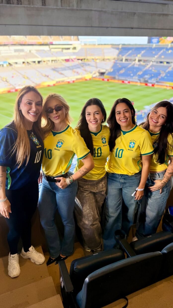 A agrônoma levou a namorada, Jessica Losi, para assistir ao amistoso da seleção. Além delas, estão Samara Pink, sócia de Virginia e Maressa Lopes, assessora da influenciadora.